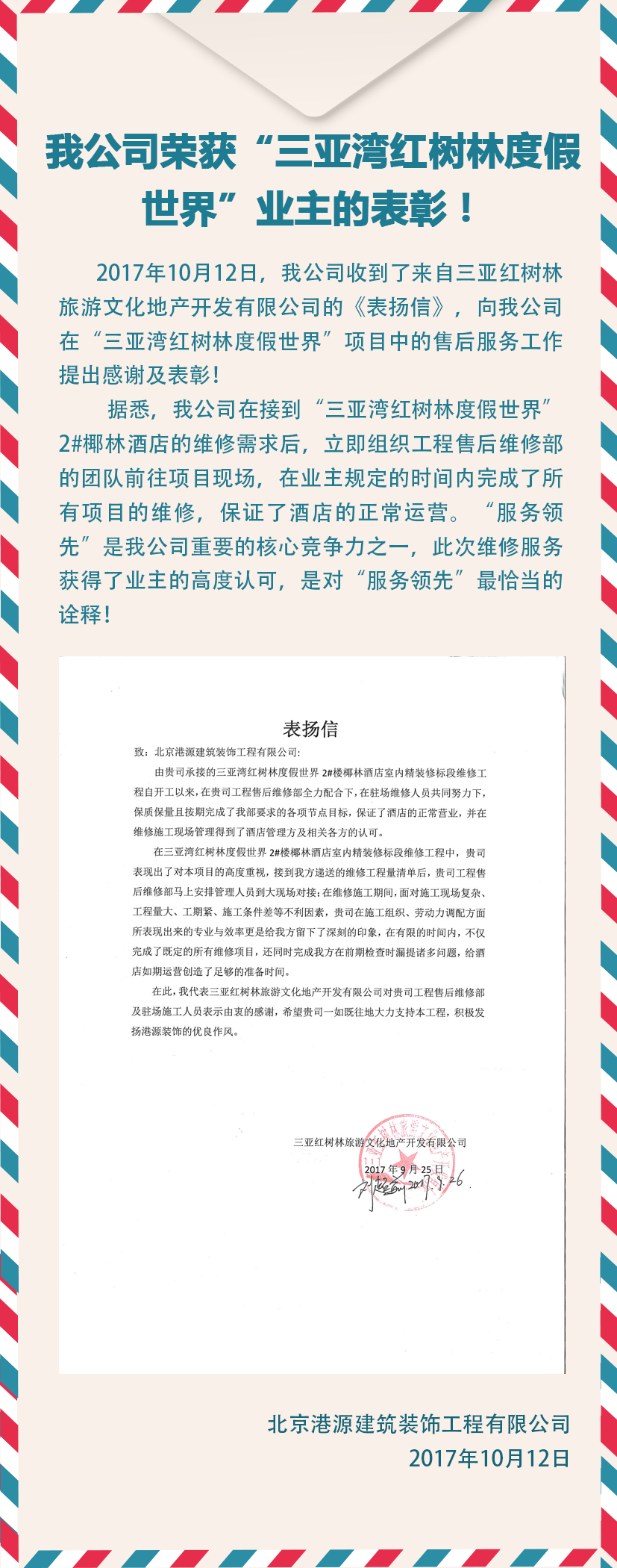 我公司榮獲“三亞灣紅樹林度假世界”業(yè)主的表彰!