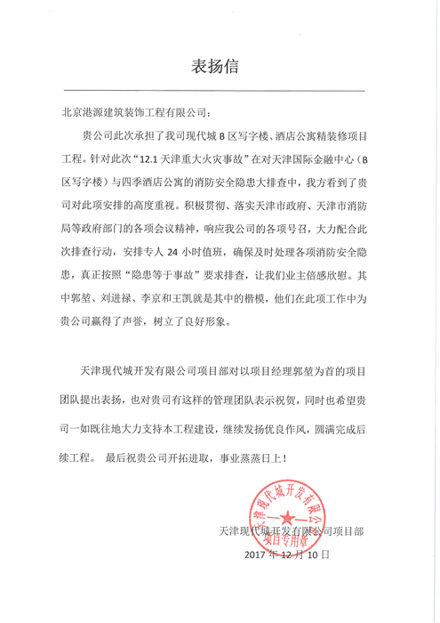 天津現(xiàn)代城項目表揚(yáng)信