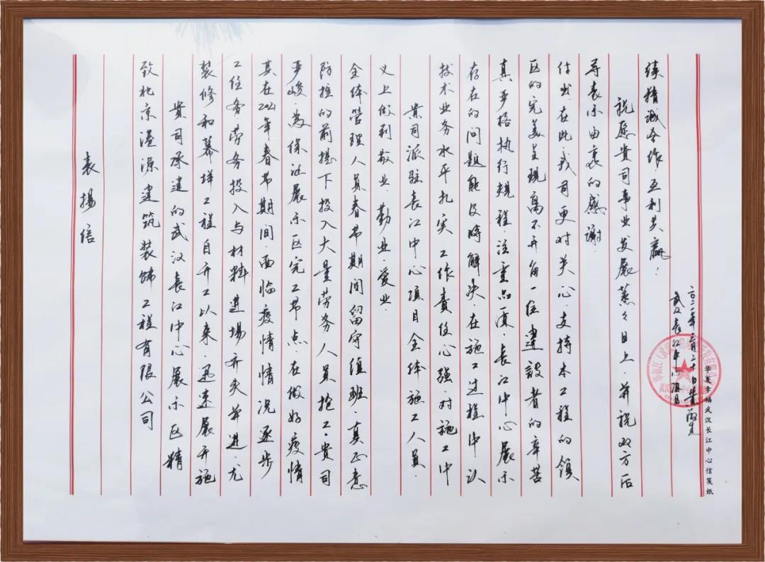 業(yè)主領(lǐng)導(dǎo)為港源裝飾親筆書寫的表?yè)P(yáng)信 港源裝飾項(xiàng)目團(tuán)隊(duì)獲得諸多表彰