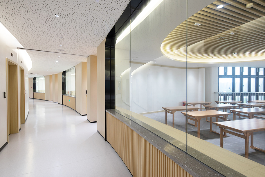 校園環(huán)境關(guān)乎著每一位孩子的身心健康,因此,學(xué)校建設(shè)更應(yīng)嚴(yán)格強(qiáng)調(diào)工程質(zhì)量的安全環(huán)保。對(duì)于這一方面,港源裝飾與甲方的意見高度統(tǒng)一,因此仿木紋金屬墻面便成為亮亮中學(xué)室內(nèi)環(huán)境的重要材質(zhì)。仿木紋金屬墻面不僅有極佳的質(zhì)感,而且具備環(huán)保、防潮、抗菌等優(yōu)勢(shì),但金屬材質(zhì)易變形的屬性也同時(shí)存在。為了堅(jiān)持環(huán)保優(yōu)先原則,港源裝飾團(tuán)隊(duì)反復(fù)論證,決定增加輕鋼龍骨等基層處理工序來保障金屬墻面的平整度及垂直度,并且達(dá)到了易于拆裝、降低維護(hù)成本的目的。