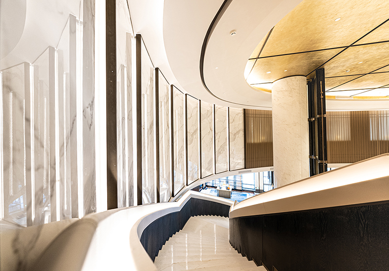 項目各個空間造型繁多、線條復雜,工期雖緊但無法批量生產(chǎn)部件,現(xiàn)場安裝也要求十分精準。具備豐富施工經(jīng)驗的港源項目團隊,在開工之前就協(xié)調(diào)各類材料廠家介入,共同討論工藝做法,以充足的施工協(xié)調(diào)能力爭取出大量的構件加工及精細施工時間。