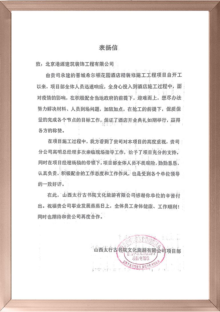 2022年9月,希爾頓集團宣布晉城古書院希爾頓花園酒店正式營業(yè)。山西希爾頓花園酒店是山西華誼兄弟星劇場的配套項目,是山西省第一家希爾頓集團酒店。項目由晉城古書院文化旅游有限公司投資興建,由希爾頓集團運營管理,室內(nèi)全部區(qū)域的精裝修工程由港源裝飾負責施工。