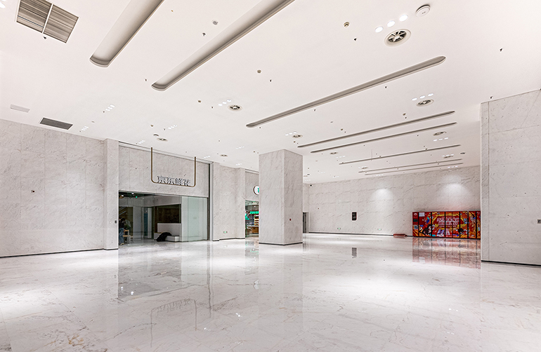 京東集團(tuán)總部二期的地下一層訪客大堂結(jié)構(gòu)挑高9米,大堂周邊墻體大部分二次結(jié)構(gòu)為連鎖砌塊砌筑,且結(jié)構(gòu)受力復(fù)雜。港源裝飾項(xiàng)目團(tuán)隊(duì)經(jīng)過(guò)多方溝通及計(jì)算預(yù)排版,決定采用穿墻螺栓預(yù)焊接、墻體雙側(cè)對(duì)應(yīng)布設(shè)埋板、局部連鎖砌塊灌注混凝土等綜合方式進(jìn)行鋼架龍骨焊接埋板的固定,以此規(guī)避了連鎖砌塊墻無(wú)法承重的缺陷,不僅避免增加甲方成本,也為大堂大空間墻面石材干掛的安全、穩(wěn)定加上一道“雙保險(xiǎn)”。